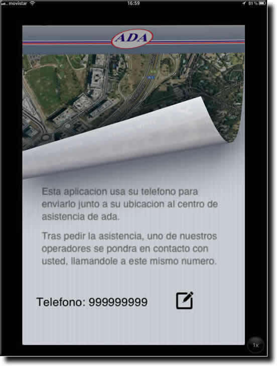 En caso de no tener conexión a internet en el sitio donde se encuentra, aparecerá un mensaje diciéndolo, indicando que pulse sobre el botón “Llamar Asit.” Este botón llamará automáticamente nuestro centro de asistencia (24 hrs), viendo usted la llamada como cualquier otra. El icono de configuración sirve para ver el numero de teléfono que usted introdujo y modificarlo si se confundió |