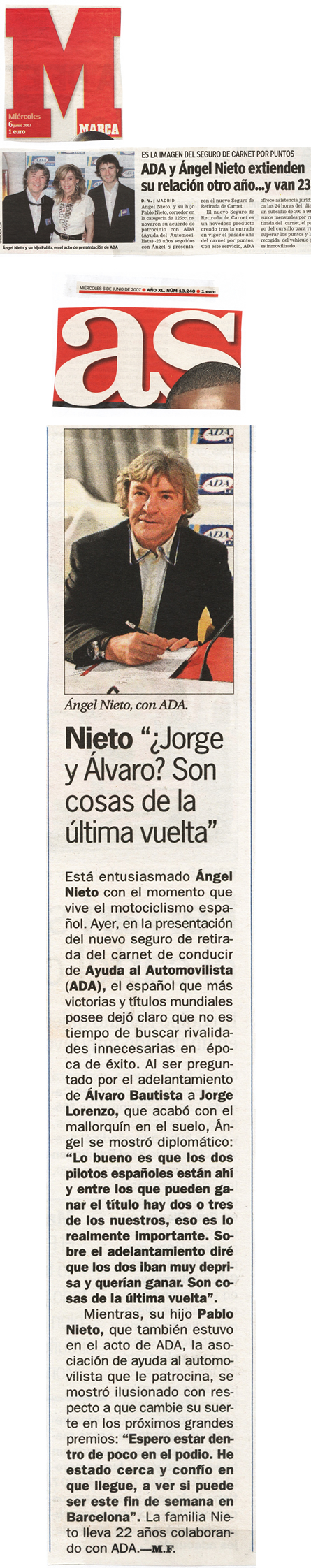 El acto oficial de la firma lo abrió la Directora General María Montes, recordando que la relación Nieto-ADA cumple ya 22 años; primero con el patrocinio del piloto que reuniera doce títulos más uno como Campeón del Mundo y ahora con Pablo Nieto, piloto del Mundial de Motociclismo.